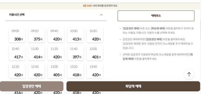 예약 홈페이지에 접속하셔서 입장권 예매하기 버튼을 클릭합니다.