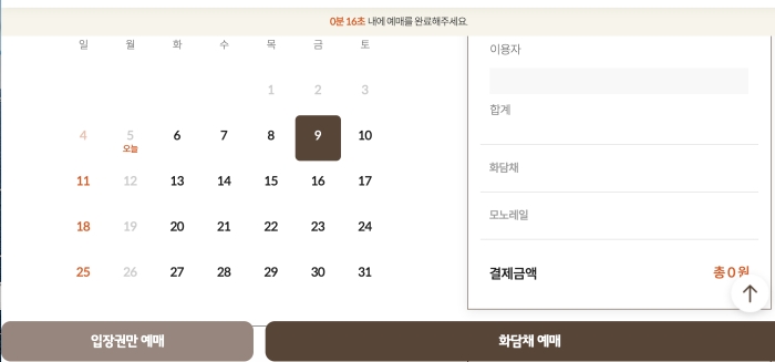 입장권만 예매 / 화담채 예매 중 화담채 예매 선택 (모노레일 예매 버튼으로 되어 있다면 모노레일 예매 버튼을 눌러 주세요.)